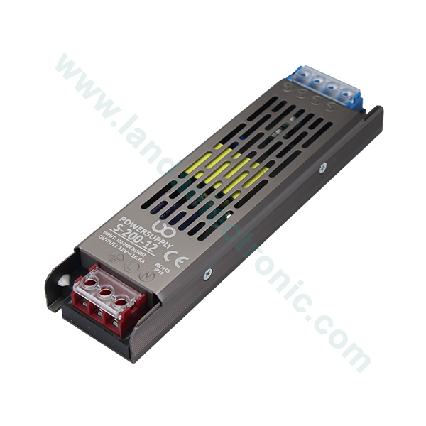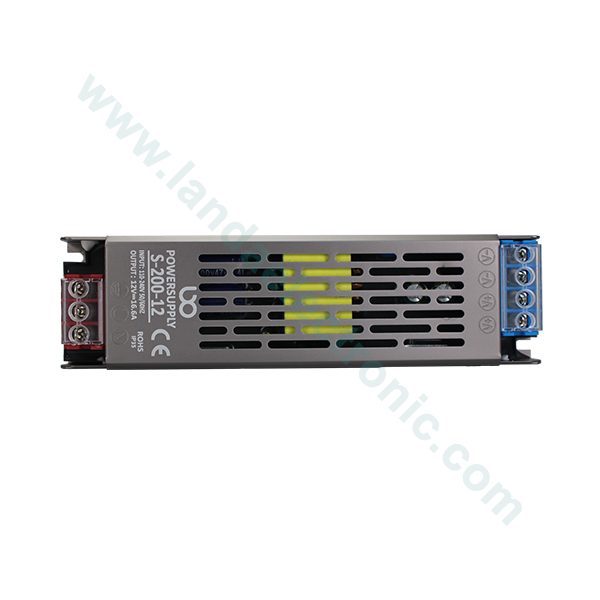 سوییچینگ اسلیم 12ولت 200 وات دارای 2 ترمینال پیچی به ترتیب از چپ به راست به ترتیب زیر است.